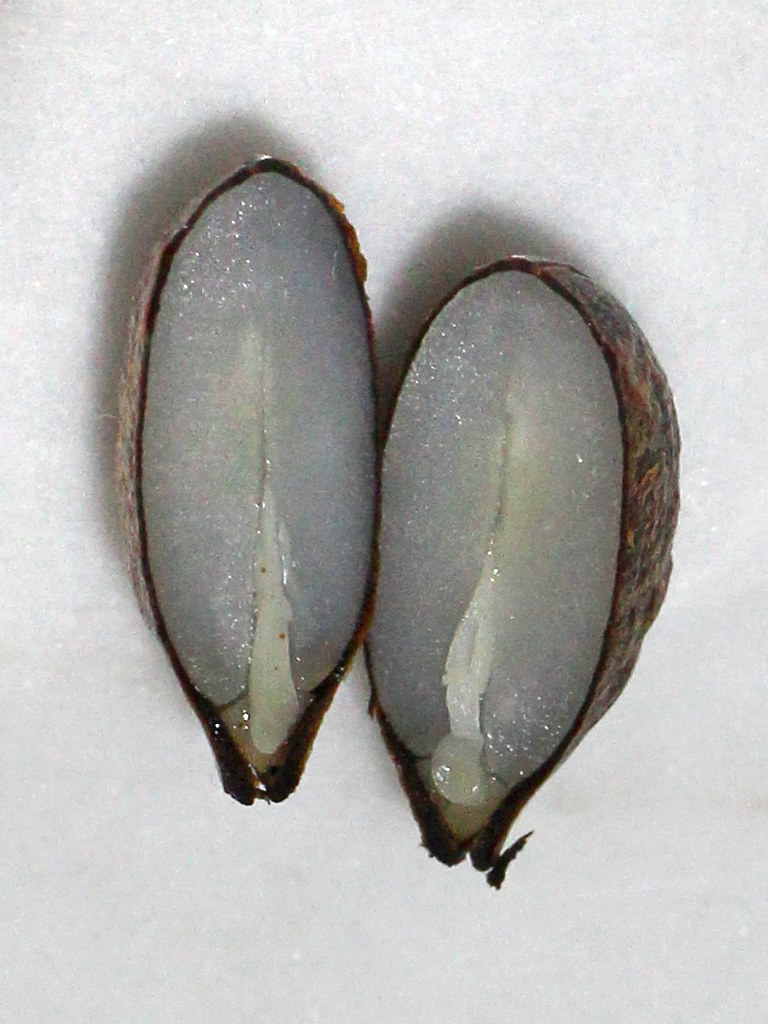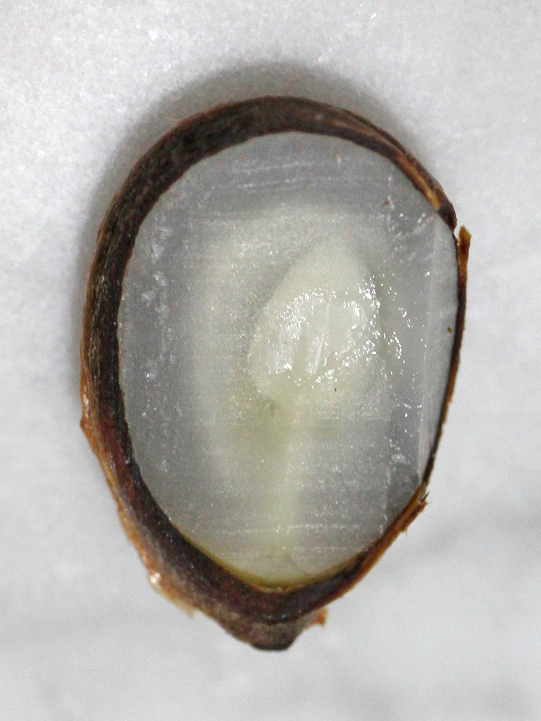 胚 (はい) embryo 子葉(しよう)、胚軸(はいじく) 種子のなかにあるやがて葉や根になる部分を胚という。 やがて葉になる子葉と根になる幼根、その二つをつなぐ胚軸からなる。 図 カキの胚 1024x768 柿の種子の中には中央に胚とその周りに発芽の栄養源となる胚乳がある。 子葉は既に葉の形をしている。 図 カキの幼根 1024x768 種子の尖った部分(写真下)にはやがて根になる幼根があり、発芽するとここから根が出る。
