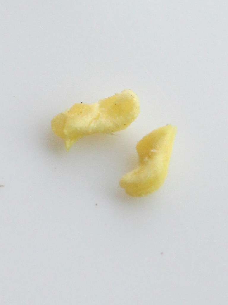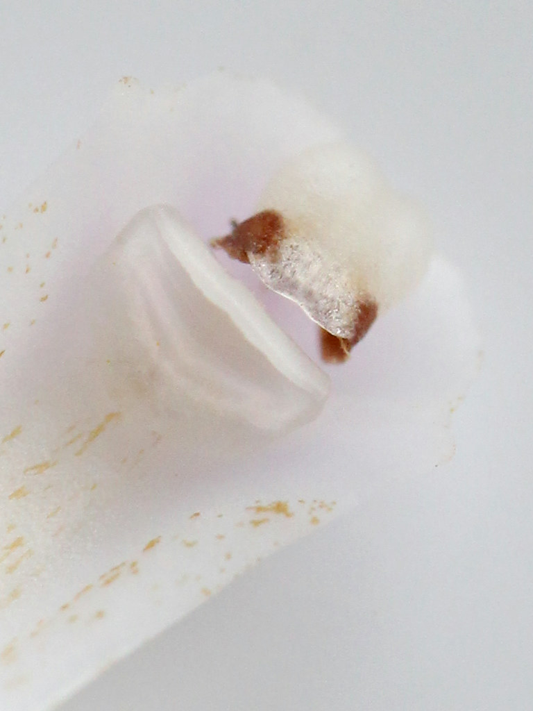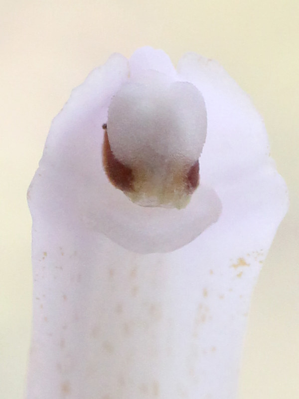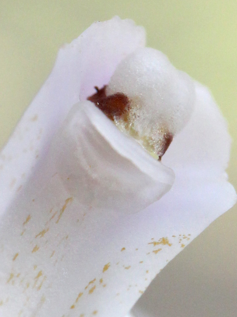 ずい柱の先端には花粉塊を包む葯帽と呼ばれる覆い(1-7)があり、半透明な葯帽の下部から花粉塊の黄色が見える 一塊になった花粉塊はこの中に入っており、この部分がおしべに相当する。