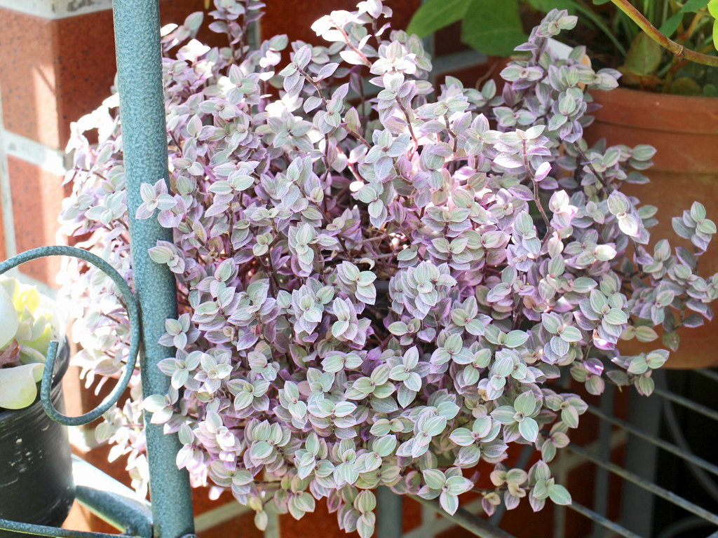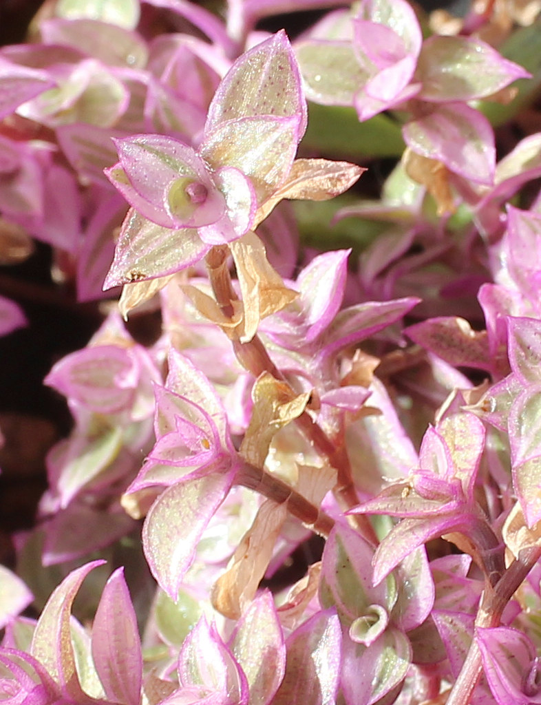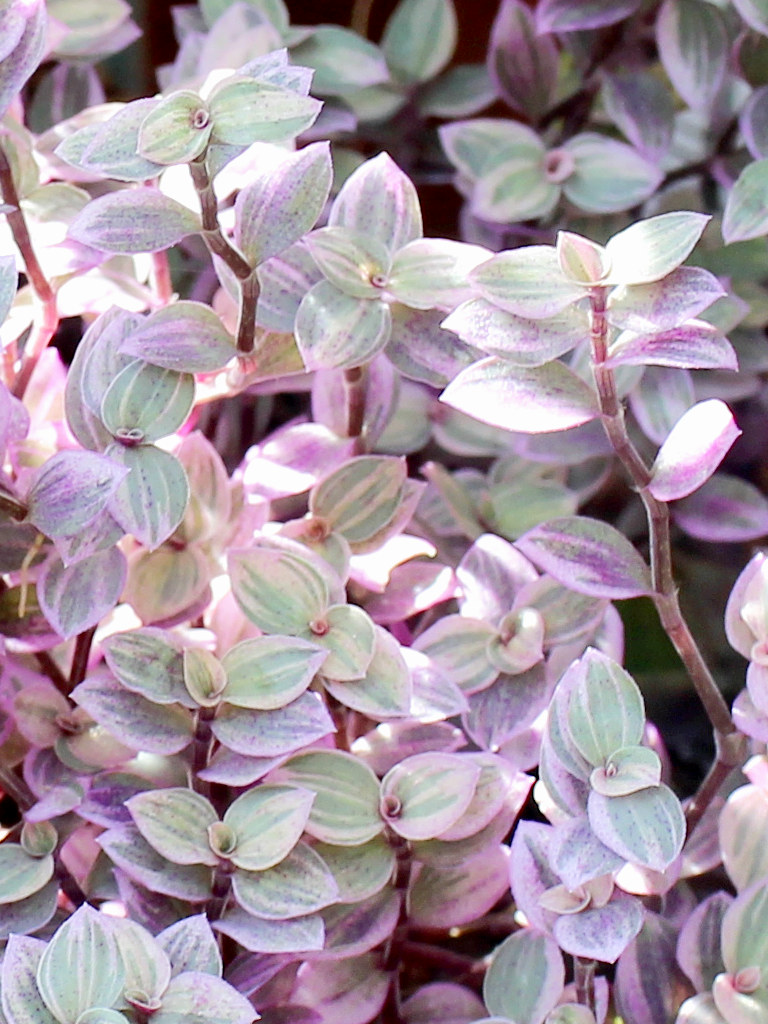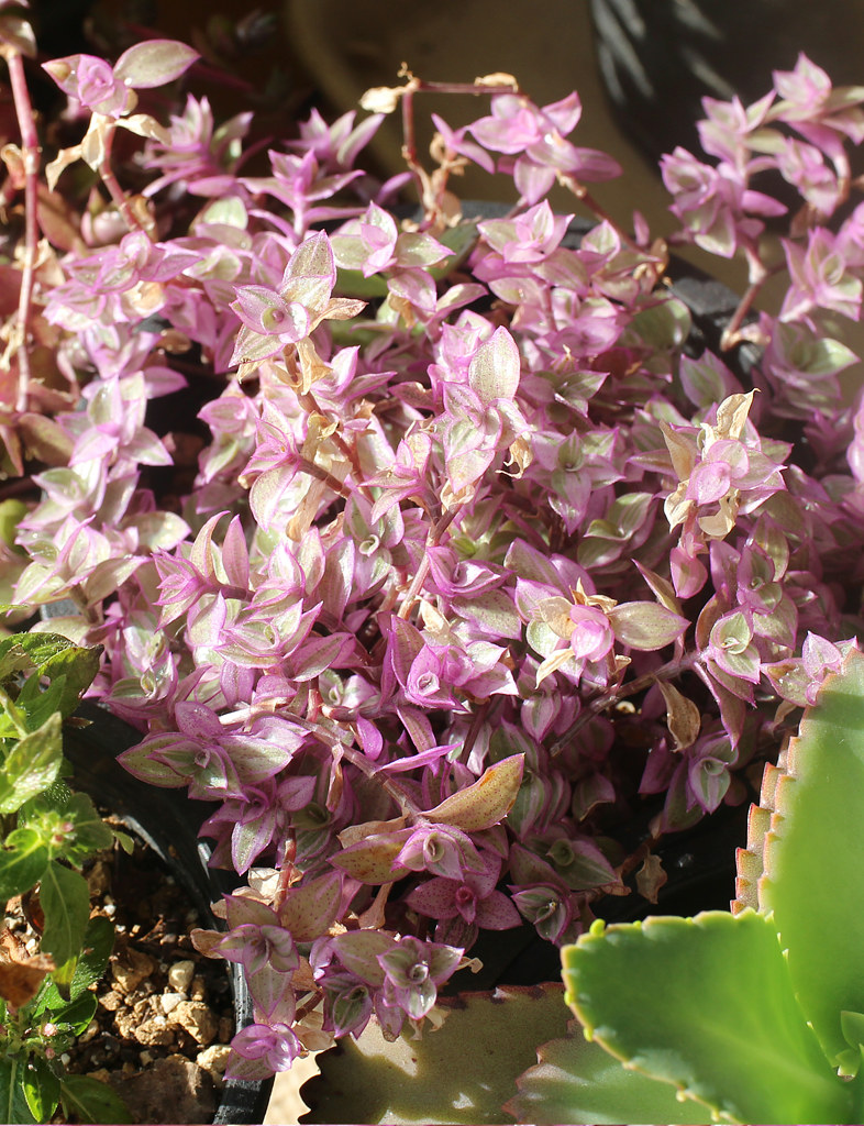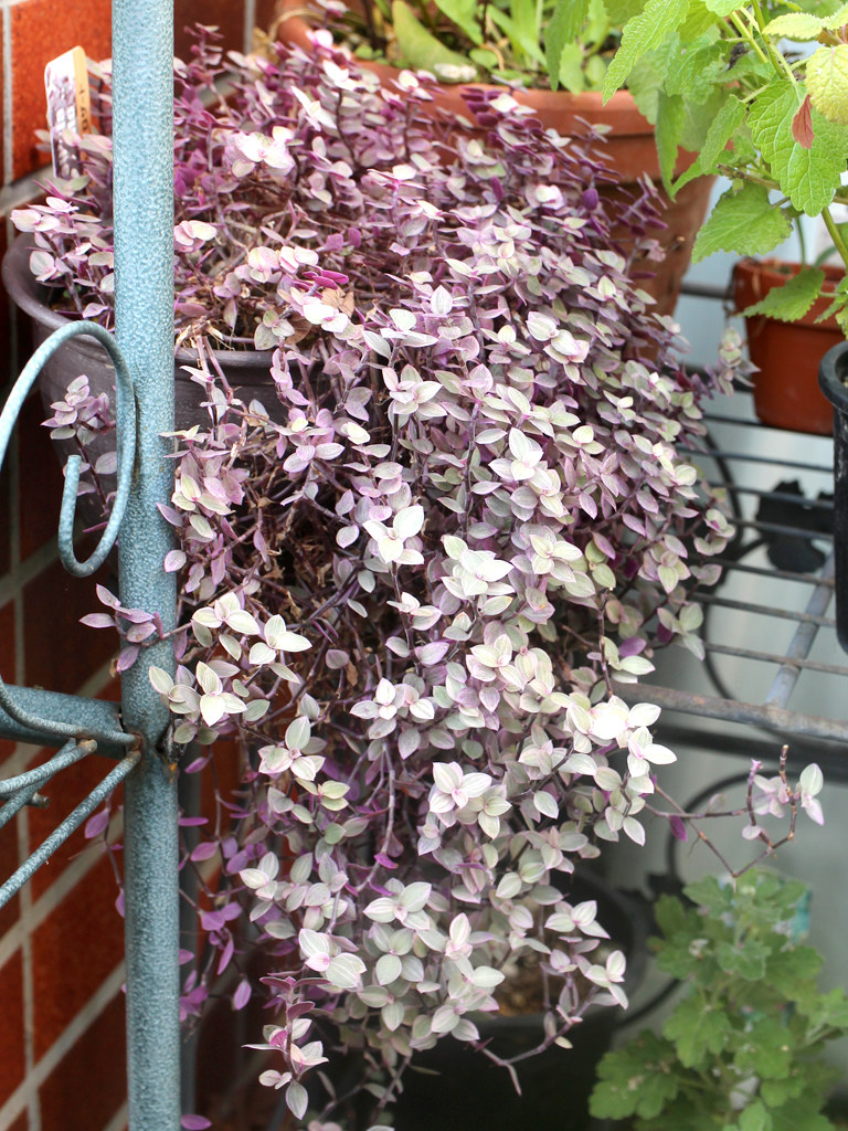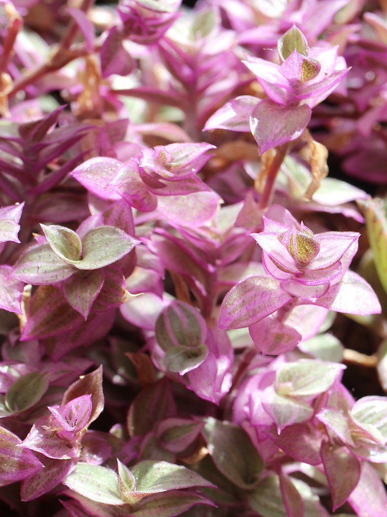 カリシア・ロザート Callisia rosato 読み:カリシア・ロザート カリッシア、シダレツユクサ(枝垂れ露草) 分類 常緑多年草 科属 ツユクサ科 / カリシア属 花期 6月から9月 花色 白 用途 鉢植え ハンギング 環境 非耐寒性 日当たりのよい場所 繁殖 株分け 挿し木 常緑性の多年草。葉のほとんどにピンク色の斑が入る。 葉は多肉質でほふく性。這うように伸びるため(1-6)枝垂れツユクサと呼ばれる。 2026/03/12 …(1-1) (春・鉢植え・室内) ピンク色の葉 葉は小さな卵形で互生する。やや多肉質で乾燥に強い。 強光には弱いが、日当たりの良い場所では鮮やかなピンク色になる。 夏から秋に咲く花 3 4 5 6 7 8 9 10 11 12 1 2 草花、野草 > 観葉植物 > 夏(6-7-8) > 秋(9-10-11) > ツユクサ科 > 2024/08/10 …(1-2) (夏・鉢植え・日陰) 夏の葉の様子 2020/06/09 …(1-3) (夏・鉢植え・日陰) 斑が消えている葉 2026/02/21 …(1-4) (冬・鉢植え・室内) 冬の葉の様子 2024/08/10 …(1-5) (夏・鉢植え・日陰) 全体の様子 (夏) 2024/10/14 …(1-6) (秋・鉢植え・日陰) 枝垂れる様子 (秋) 2024/10/14 …(1-7) (冬・鉢植え・室内) 全体の様子 (冬の室内)