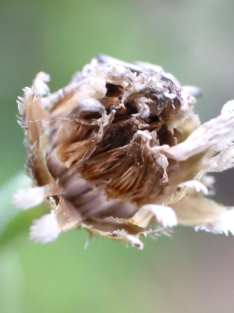 果実は楕円形の痩果で先端に茶色の短い冠毛がつく。