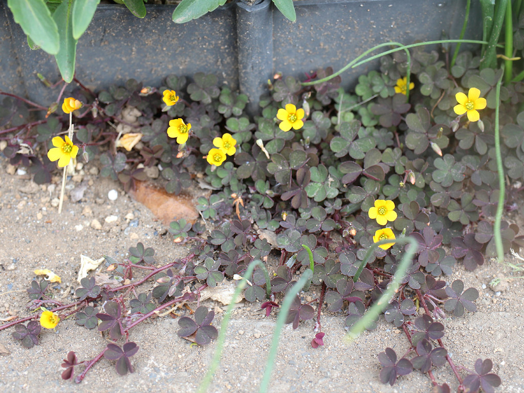 常緑性の多年草。道端や空地などで見られる。 カタバミの仲間には果実を作り増えるものと球根で増えるものとがあり、 このアカカタバミやカタバミは果実を作り増え、イモカタバミやオキザリスは球根で増える。
