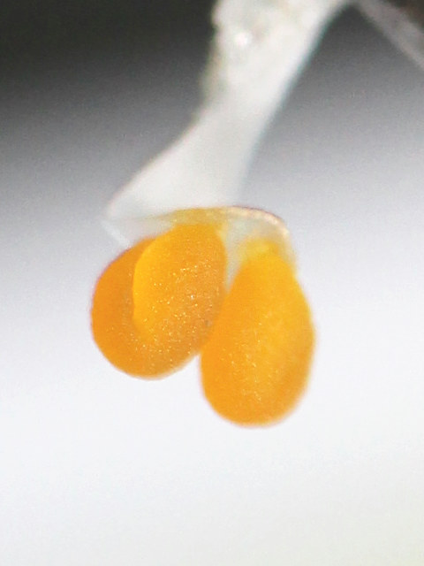 先端には2つの花粉塊がつきそれを三角形の薄い葯帽が包み保護している。