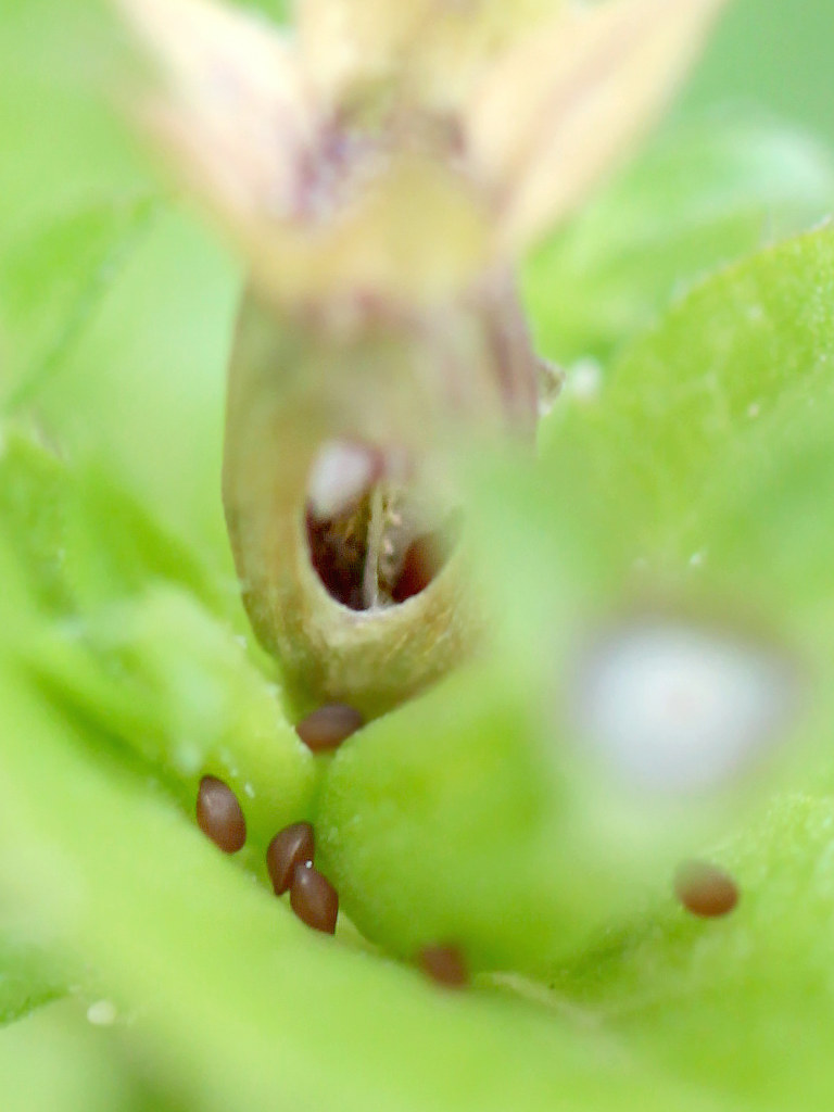 閉鎖花は開花せず自家受粉を行い結実する。 子房と花托と癒合した子房下位の植物でその上には数枚の萼片がつく。 写真左上の子房にはやがて裂開する孔が空く場所が見える。