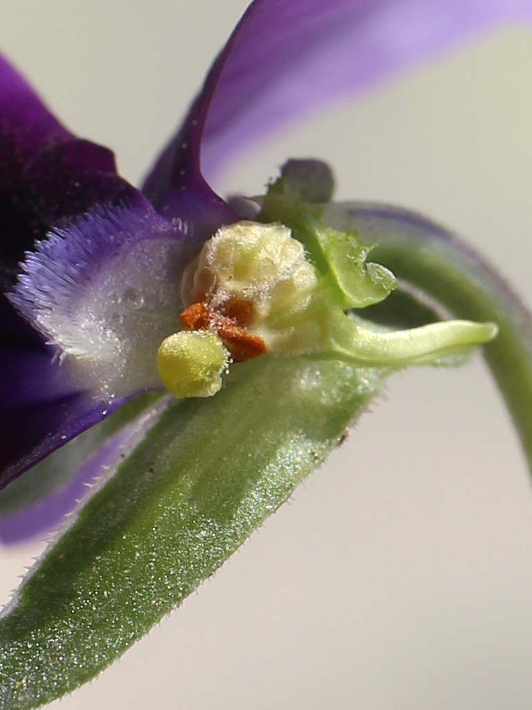 おしべの後方には2本の脚柱があり距の中へ長く伸びる。蜜を吸いに訪れた虫がこの脚に触れるとおしべが揺れ虫に花粉を落とす仕組みとなっている。