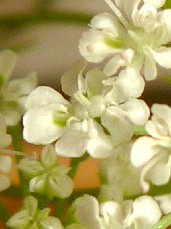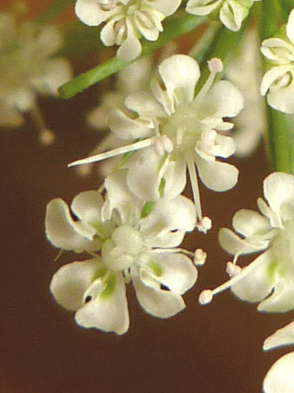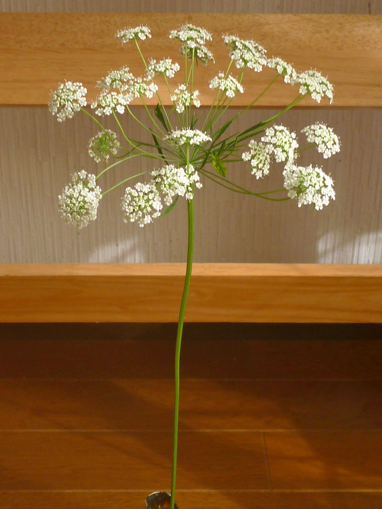 花序は複散形花序で、複数の散形花序(1-2)が集まって1つの花となっている。 ニンジンやセリなどに比べ、それぞれの散形花序同士は離れている。