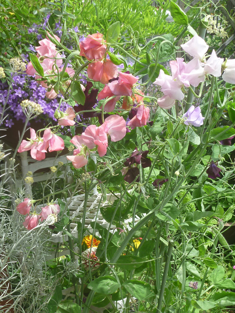 スイートピーは茎は巻かず、巻きひげが周りに絡みつき上へと伸びる。主に切花に向く高性種で高さは2mほどにもなる。