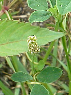 花序は総状花序で小さな蝶形花が多数集まり球形となる。 花はシロツメクサなどによく似るが果実は大きく異なっている(1-3)。