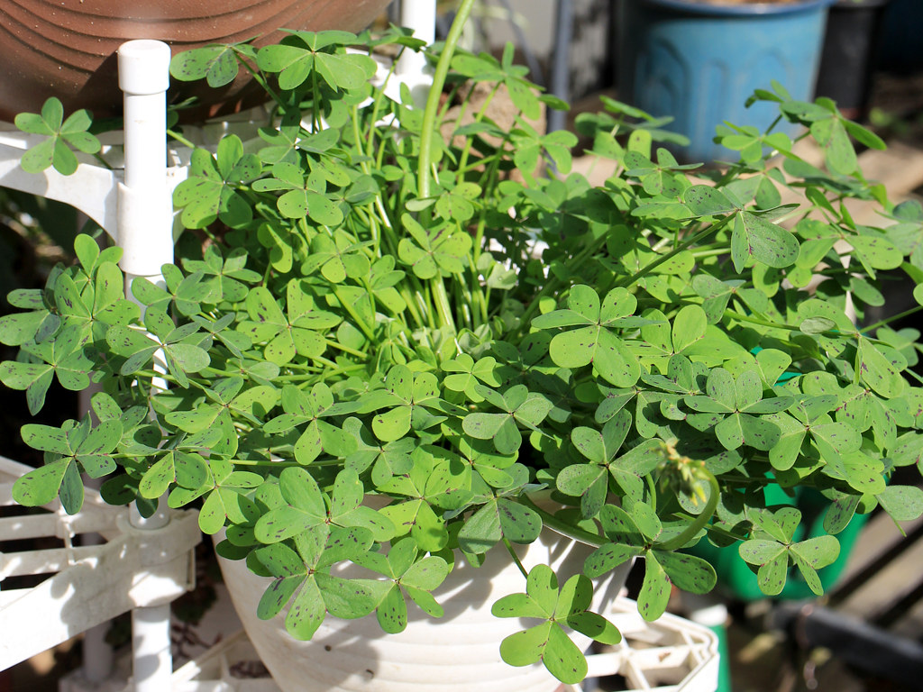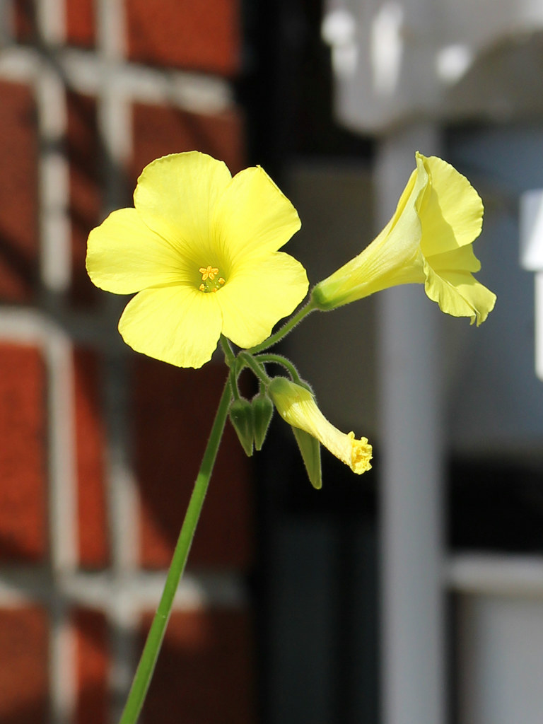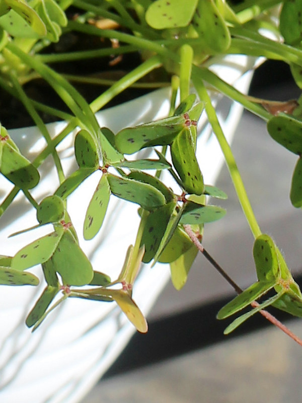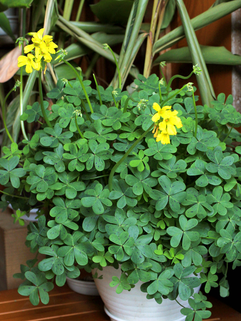 オオキバナカタバミ Oxalis pes-caprae 読み:オキザリス・ペスカプラエ 大黄花片喰、酢漿草、傍食 分類 常緑多年草球根植物 科属 カタバミ科 / カタバミ属 花期 3月から11月 花色 黄 用途 鉢植え 地植え 環境 耐寒性 日なた 繁殖 分球 南アフリカ原産の常緑性の多年草で、葉に紫色の斑点がある(1-3)。野生化している帰化植物で日当たりの良い場所などで見られる。 2021/04/25 …(1-1) (春・鉢植え・日なた) 黄色の花 1024x768 花は花弁5枚で基部は漏斗形になっている。 暖かくなると花茎を伸ばし先端に複数の小花をつける(1-5)。 春から秋に咲く花 3 4 5 6 7 8 9 10 11 12 1 2 草花、野草 > 黄 > 常緑性 > 春(3-4-5) > 夏(6-7-8) > 秋(9-10-11) > カタバミ科 > 2021/04/25 …(1-2) (春・鉢植え・日なた) おしべとめしべ 1024x768 おしべは10本で、長い5本と短い5本が内側と外側に輪になってつく。 めしべは1本で花柱は5本あり、短いおしべの花糸の隙間から柱頭が出るようになっている。 2021/11/08 …(1-3) (秋・鉢植え・日なた) 葉の様子 1024x768 葉は3出複葉で小葉はハート形。葉には濃い紫色の斑点がある。 朝夕や曇りの日には葉を閉じる(1-8)。 2021/04/25 …(1-4) (春・鉢植え・日なた) 全体の様子 1024x768 草丈は高さ30cmほど。花は葉と同じように日が当たると開き、朝夕や曇りの日には閉じている。 2022/04/21 …(1-5) (春・鉢植え・日なた) 茎先の花 1024x768 2024/10/31 …(2) (春・鉢植え・日なた) 小さな株 1024x768 2021/11/08 …(1-6) (秋・鉢植え・日なた) 秋の様子 1024x768 写真の鉢は中央から花のつぼみが伸びている。寒くなったら屋内に入れ温度を保てば周年開花する(1-7)。 2022/01/03 …(1-7) (冬・鉢植え・日なた) 冬の屋内の開花の様子 1024x768 2023/12/26 …(1-8) (春・鉢植え・日なた) 閉じている葉の様子 800x600 耐寒性が強く屋外でも越冬する(1-9)。 2024/03/10 …(1-9) (春・鉢植え・日なた) 屋外で越冬した様子 1024x768 屋外で越冬した場合は葉がある程度枯れ、草丈も低くなる。