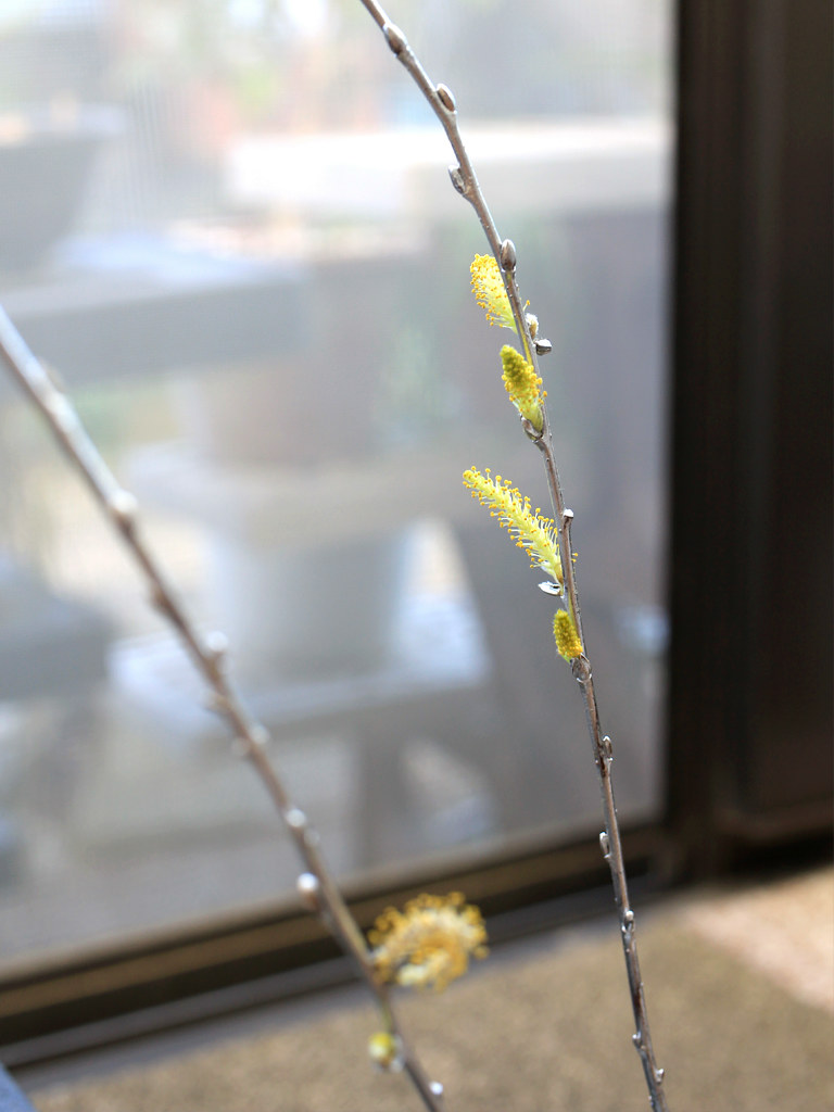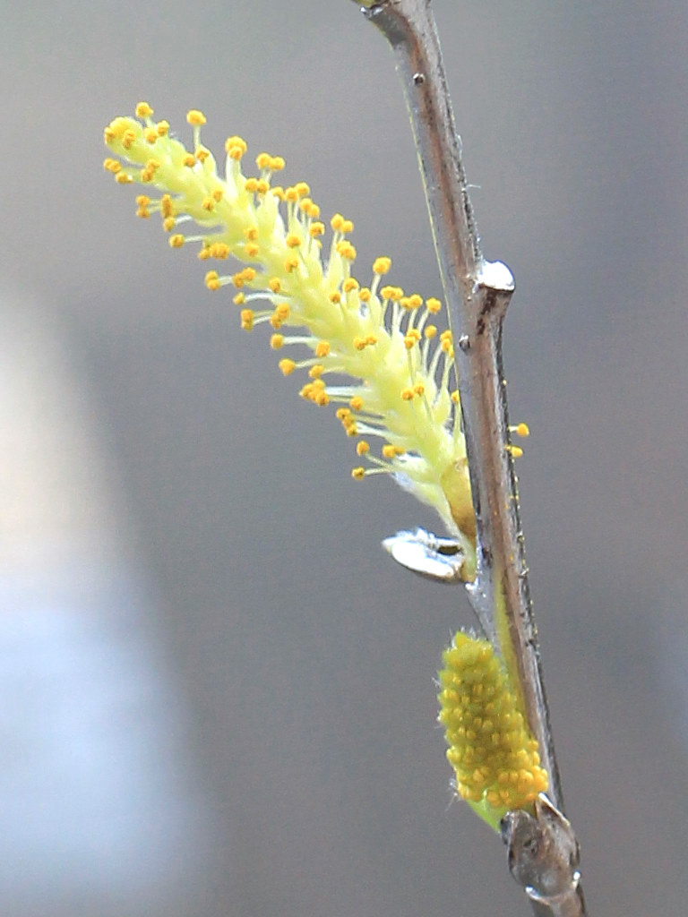 ヤナギは雌雄異株の植物で雄株にはおばなを、雌株にはめばなをつける。 雌雄共に花弁は無く、雄花は多数の花粉の黄色で花序は黄色く見え、 雌花は多数の子房の緑色で花序は緑色に見える。