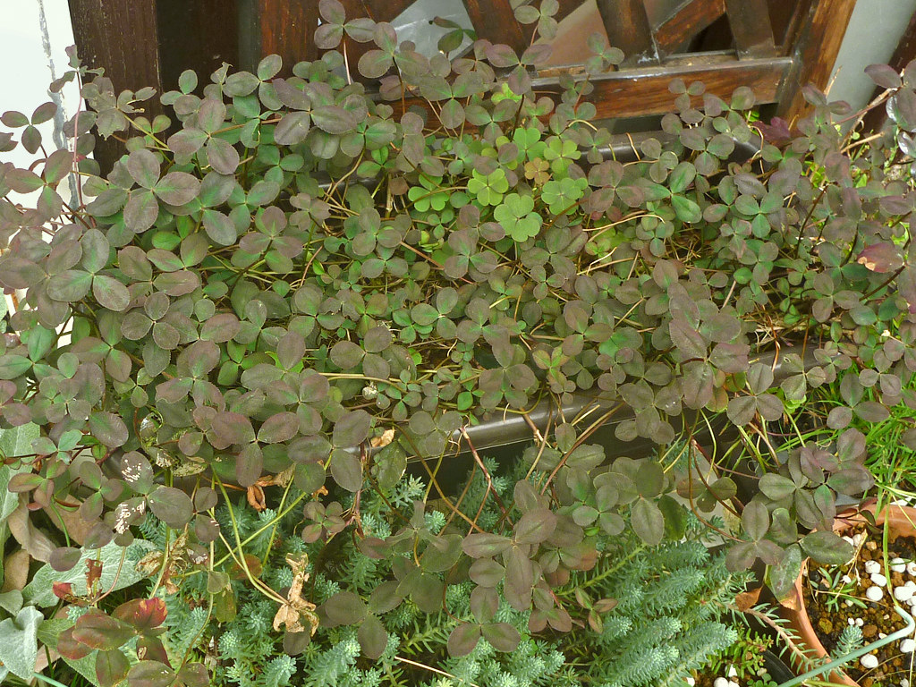 常緑多年草。シロツメクサの園芸品種で花と葉が赤く、赤葉クローバーや銅葉クローバーとも呼ばれる。