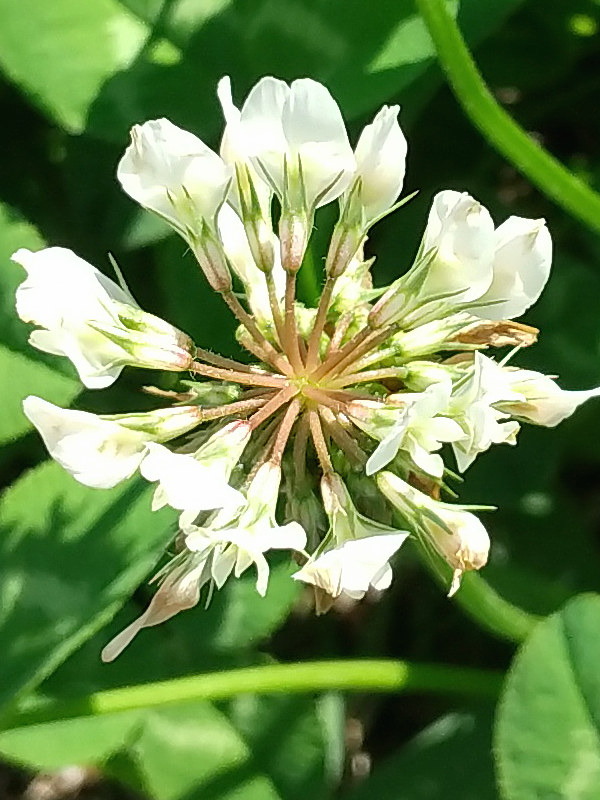 春から秋にかけて花茎を上に伸ばし球状の花をつける。 シロツメクサはこの長い花茎を編んだ花冠としても知られる。 春先の開花時は葉がまだ小さいことも多い。