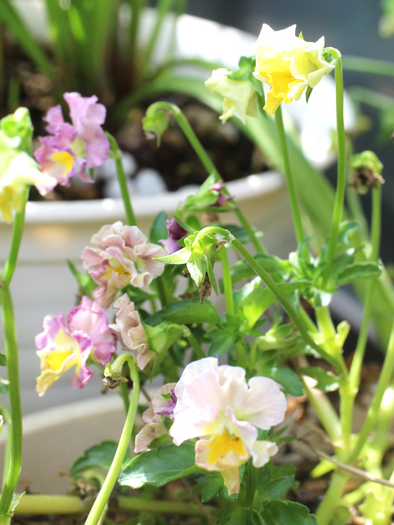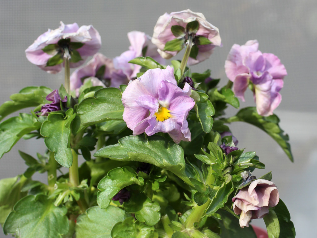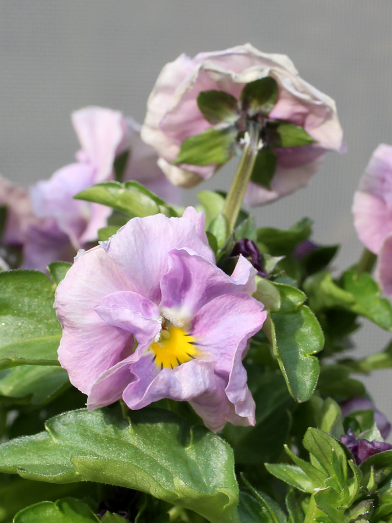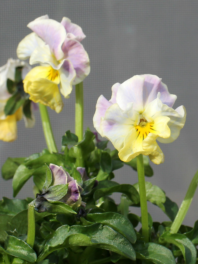 秋まきの1年草。ヌーヴェルヴァーグ (新しい波) と名付けられたビオラの改良品種で、 一つの花に複数の色が混ざり、その花色は100種類以上と言われる。
