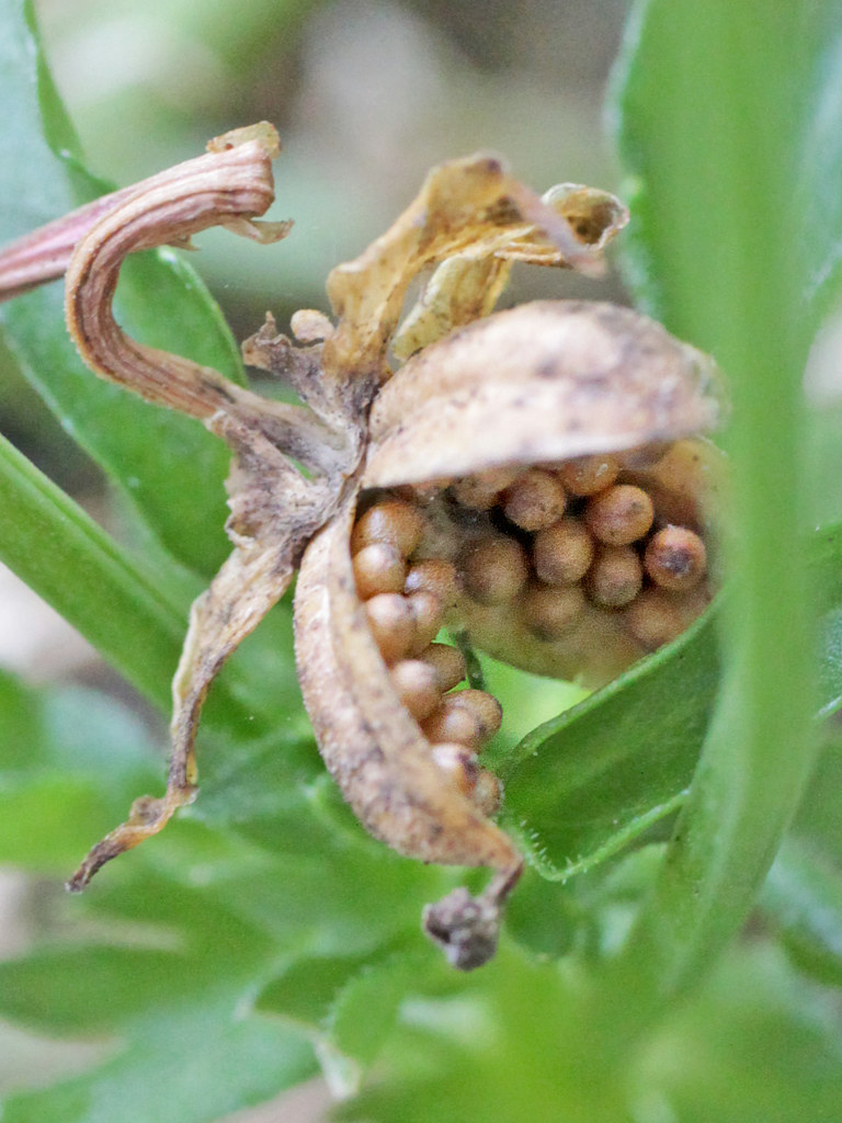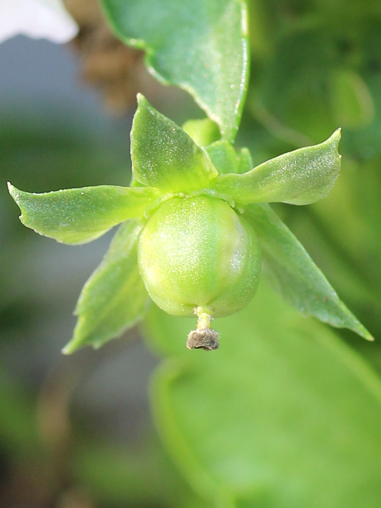 おしべは5本で、奥に見える白い部分が葯で先端にオレンジ色の付属体がつく。 めしべは1本で柱頭には穴のようなくぼみがあり(1-5)、 この中に花粉が入ると受粉となる。