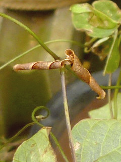 豆果 (とうか) legume 莢果 (きょうか) マメ科に見られる、莢の中に種子が入った果実を豆果という。 1心皮からなる乾果で裂開果の一つで、 熟すと果皮が2方向に捩れて裂け種子を遠くへ飛ばす働きをする。莢果とも呼ばれる。 同じく裂開果で2心皮以上からなるものは特に蒴果と呼ばれる。 図 ヤブマメの豆果 800x600 ヤブマメの豆果は若いうちは緑色で枝豆のような姿をしている(1-3)。 後ろに見えるロール状のものが種子散布後に残った果皮で、果実は乾燥により裂開する。 用語画像 > 索引 用語名 > 図 裂開した豆果 (ヤブマメ) 莢は熟すと下から2つに裂け果皮は上に捩れる。 図 若い莢と中の豆 (ヤブマメ) 800x600 中の種子(豆)が透けて見える。中には数個の種子が入っている。 図 大きいもの 1024x768 シロナタマメの豆果は長く大きい。 図 毛が生えているもの 800x600 スイートピーの豆果には白い毛が生えている。 図 翼があるもの 1024x768 シカクマメの豆果にはひらひらした翼がある。