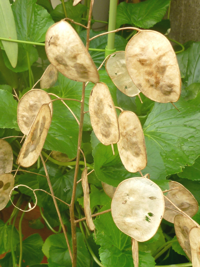 角果 (かくか) silique and silicle 長角果(ちょうかくか)、短角果(たんかくか) 蒴果の一つで、2枚の心皮からなり その間を仕切る薄い膜、隔膜を持つアブラナ科特有の果実を角果という。 果実の長さが幅の3倍以上のものを長角果それ以外を短角果という。 図 細長いもの 1024x768 キャベツは細長い形の長角果で、熟すと両側が裂け種子を放出する。 写真中央奥に見える銀色の膜がアブラナ科に見られる果実を仕切る隔膜で、これは種が落ちた後も残る。 用語画像 > 索引 用語名 > 図 丸いもの 1024x768 ルナリアは広楕円形の短角果で、果実は大きく薄い。 中にある種が透けて見える。 図 ハート形のもの ナズナの果実はハート形で小さい。果実を仕切る膜は楕円形でハートを二分するように中央にある。
