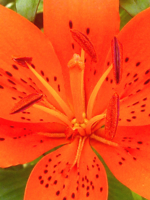 スカシユリの花柱も同じく3心皮が合着して1本となっている。 ユリ科の植物は子房上位のため花を覗くと花柱の下に子房が見える。